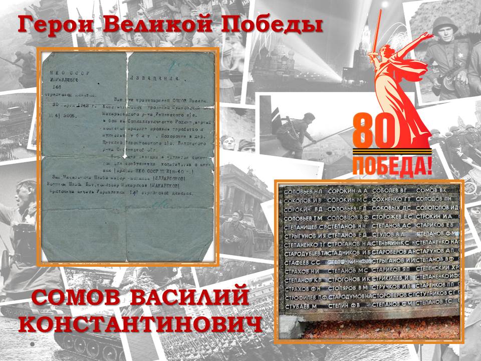 В преддверии 80-летия Победы в Великой Отечественной войне 1941-1945 г.г. представляем серию публикаций о Героях Великой Победы – из семейных архивов работников Управления Судебного департамента в Костромской области. Из семейного архива Сомова Алексея Владимировича, начальника Управления Судебного департамента в Костромской области: Мой дед, Василий Константинович Сомов, 1901г.р., уроженец Макарьевскго района Костромской губернии, был председателем колхоза. В 1941 г. он был призван на фронт и попал в формировавшуюся 332 Ивановскую стрелковую дивизию им. Фрунзе. В октябре 1941 года дивизия была направлена на оборону Москвы. Мой дед погиб 18 февраля 1942 г. около деревни Щеткино Велижского района Смоленской области. Вот хроника тех дней: «Противник не только удерживал г. Велиж, но и наращивал здесь силы. 15 февраля немцы заняли М. Ржаву, 16 февраля - Тиванцы, Щеткино, Проявино. Ввод в бои за Велиж 332 стрелковой дивизии приостановило продвижение противника. 17 февраля фашисты потерпели поражение в районе Васюки - М. Ржава, Крутое, Заречье, Старое Село. В течение трех суток были освобождены Курбатовщина, Щеткино, О(А)чистка, Проявино, Тиванцы, Цыганы». Первоначально дед Василий был захоронен в братской могиле в д. Щеткино, а затем перенесен на Мемориальный комплекс «Лидова гора» в г. Велиж Смоленской области. С детства о моем деде я знал только то, что он погиб на войне. Я никогда не видел фотографию деда, у бабушки сохранилась лишь его «похоронка» - изветшавшая обложка школьной тетради, на которой напечатано извещение о гибели моего деда, которая и стала для меня самым ценным символом Победы.
