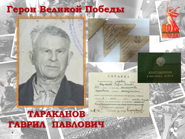 Мой дед, Тараканов Гаврил Павлович, родился в 1905 г. в дер. Солониково Костромского района тогда еще Ярославской области. Поступил на службу в июле 1941 года. Воевал на Беларусском фронте в составе 836-го зенитного артиллерийского полка 12-ой зенитной артиллерийской Брестской дивизии. Окончил войну командиром пулеметного отделения указанной дивизии.