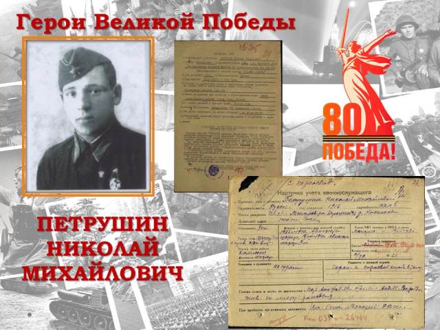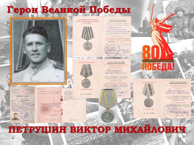 Мой дедушка, Виктор Михайлович Петрушин, родился 10 декабря 1918 года в деревне Киселиха Макарьевского района Костромской области. После окончания семилетней школы получил специальность «тракторный механик», работал в колхозе. 7 октября 1938 года был призван на действительную военную службу в 17-й кавалерийский полк. С августа 1942 года – командир отделения 15-го запасного кавалерийского полка. В феврале 43-го года переведён старшиной в 481-ю отельную зенитно-артиллерийскую дивизию, где получил военную специальность «пулемётчик зенитных пулемётов». С июня 43-го года по декабрь 45-го года - старшина роты 1254 аэродромного полка. Служба в армии у Виктора Михайловича растянулась на семь долгих лет. Дедушка воевал на различных фронтах, о чём свидетельствуют боевые награды (1943 год – медаль «За боевые заслуги», 1944 год – медаль «За оборону Кавказа», 1945 год – медаль «За Победу над Германией»). Прошёл всю Европу, службу закончил в Германии. После войны Виктору Михайловичу были вручены медали «За взятие Будапешта» (1947 год) и «За взятие Вены» (1948 год). После возвращения с фронта Виктор Михайлович работал на Макарьевской машинно-тракторной станции, женился, родились сын и дочь. В браке прожили более полувека. Оба были удостоены звания «Ветеран труда» (1979 год). Николай Михайлович Петрушин (1916 г.р.) - родной брат моего дедушки призван в армию Макарьевским РВК Ивановской области. Проходил службу в должности водителя автороты обеспечения 1-го танкового батальона, имел звание старший сержант. Получил тяжелое ранение Награжден Орденом Красной Звезды.