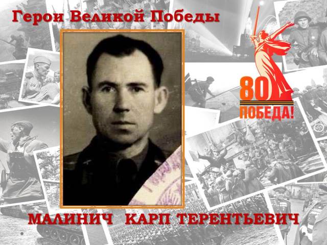 Мой дед, Малинич Карп Терентьевич, родился 26.10.1913 в Винницкой области Украинской ССР. Когда ему исполнилось 22 года, был призван на военную службу в ряды советской армии. С момента начала войны был отправлен на Центральный фронт в 315 разведывательный авиационный полк в должности гвардии техника-лейтенанта. Только по состоянию на сентябрь 1943 года обеспечил 200 боевых самолетовылетов на разведку глубокого тыла противника (по сведениям из наградного листа от 02.09.1943 к Ордену «Красной звезды». Звено, которым руководил техник-лейтенант Карп Терентьевич, содержало материальную часть в постоянной боевой готовности. Не было ни единого случая возвращения с невыполненным боевым заданием по вине материальной части. Малинич К.Т. быстро устранял неисправности. Неоднократно вводил в строй неисправные самолеты, ремонтируя в сложных полевых условиях при бомбежке противника. Восстановил десятки самолетов и заменил десятки моторов. За боевые заслуги на фронте, проявленный героизм и мужество неоднократно был награжден медалями «За боевые заслуги», «За оборону Москвы», «За победу над Германией в Великой Отечественной войне 1941-1945 гг.», «За освобождение Праги», «За взятие Берлина», а также Орденом «Красной звезды». После окончания войны продолжал служить в армии и трудиться на благо Родины. Вышел в отставку в звании капитана в 1956 году. Затем долгое время работал на Смоленском заводе электроинструментов «Диффузион». ![]() |